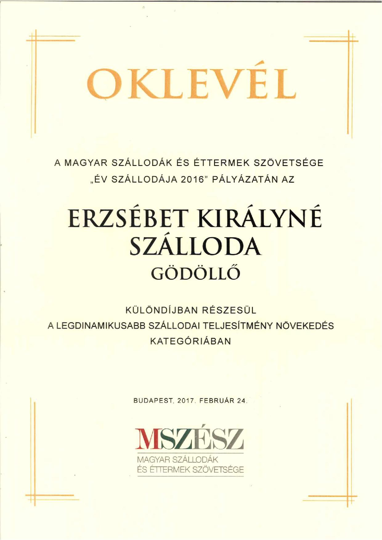 A legdinamikusabb teljesítménynövekedés kategóriában érdemelt ki különdíjat a Magyar Szállodák és Éttermek Szövetségének (MSZÉSZ) éves seregszemléjén, az immár negyedik alkalommal meghirdetett Év szállodája versenyen az Erzsébet Királyné Szálloda és Étterem.