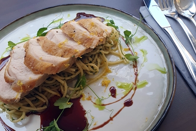 Míg sül a csirkemell, tegyünk fel főni egy nagy fazék vizet. Sózzuk megfőzzük a spagettit a csomagoláson jelzett időhöz képest 2 perce rövidebb ideig. Ha a tészta elkészült, szűrjük le. (A tészta főzőlevéből tartsunk meg egy pohárnyit.) Magasfalú serpenyőbe vajat hevítünk majd 3 evőkanál főzőlével emulziót készítünk, majd beletesszük a spagettit sóval borssal és a petrezselyem felaprított zöldjét is. Addig kevergetjük és adagoljuk a tészta főzőlevét ameddig nem kapunk egy krémes, tejszínszerű bevonatott minden egyes szál tésztán. A csirkemellel azonnal frissen fogyasztjuk.